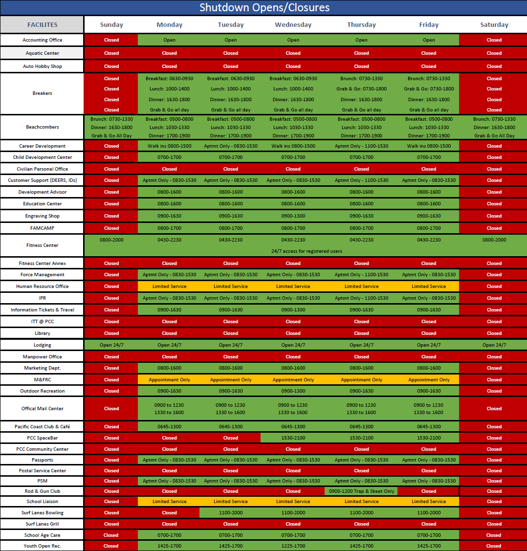 Check status of local commissaries to determine the status of your local store. During a shutdown some non-appropriated fund services may continue to operate. Check with your local installation’s website to determine which services will remain open in your area. If able, plan ahead and minimize its impact on day-to-day routine.