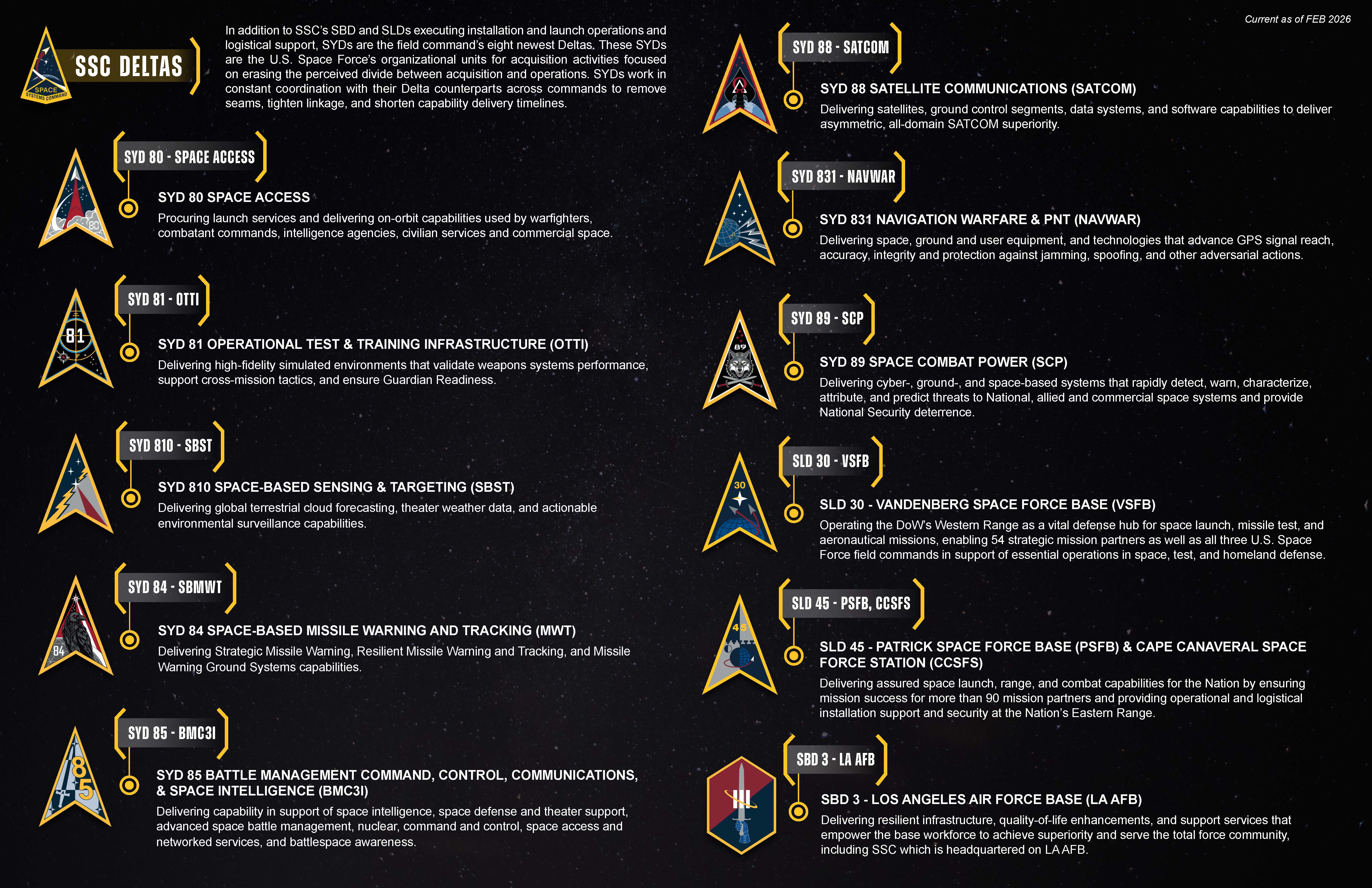 Space Launch Delta 30, Vandenberg's host unit, supports West Coast launch activities for the Air Force, Department of War, National Aeronautics and Space Administration, national programs and various private industry contractors. SLD 30 supports the processing and launch of a variety of expendable vehicles including Atlas V, Delta IV, Pegasus, Minotaur, and Falcon 9. The Delta also supports Force Development and Evaluation of all intercontinental ballistic missiles, as well as Missile Defense Agency (MDA) test and operations.