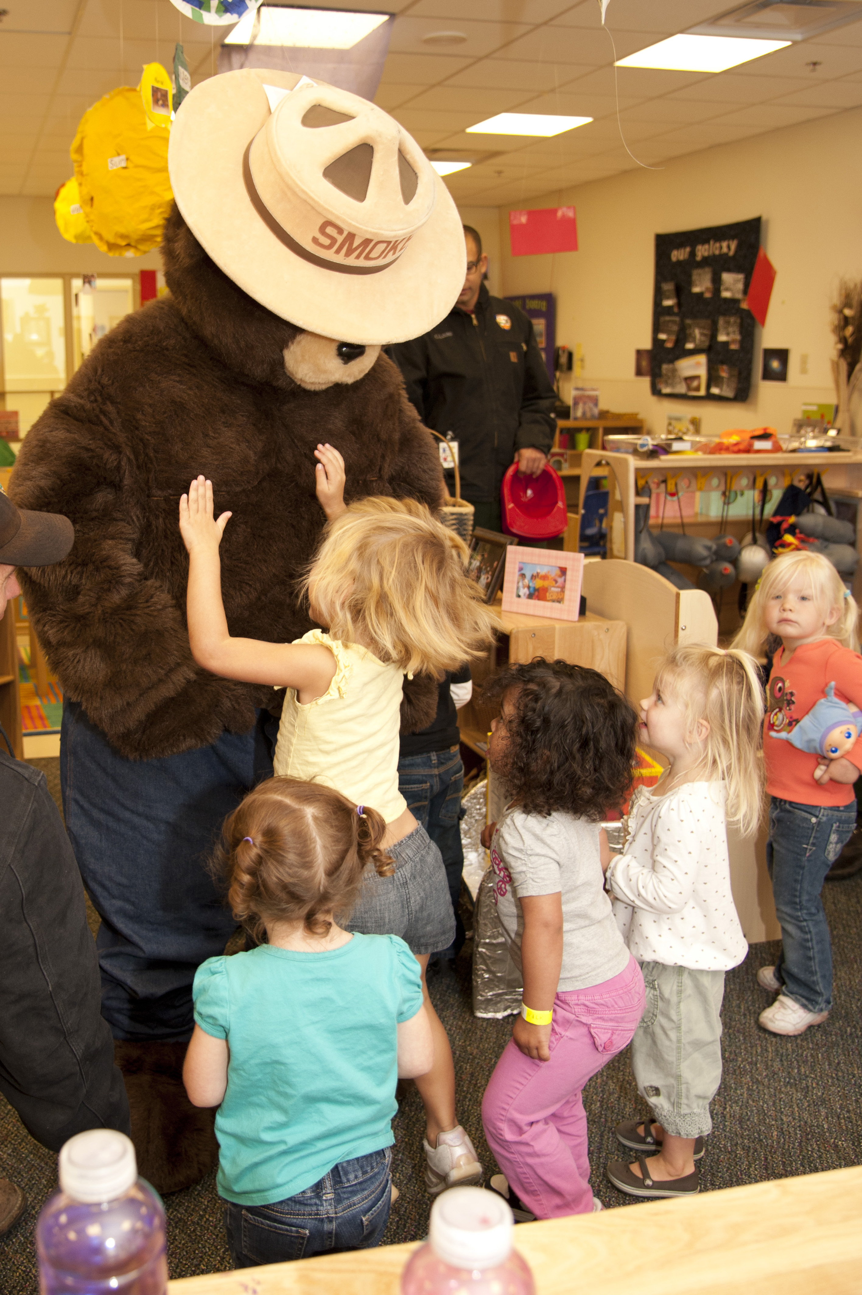 VANDENBERG AIR FORCE BASE, Calif. – Smokey the Bear and Sparky, Vandenberg Fire Departments mascot, visit the children at the Child Development Center here Wednesday, Oct. 10, 2012. The mascots visited the CDC to kick-off Fire Prevention Week. FPW has events scheduled daily until Friday, October 13. (U.S. Air Force photo/Senior Airman Lael Huss)