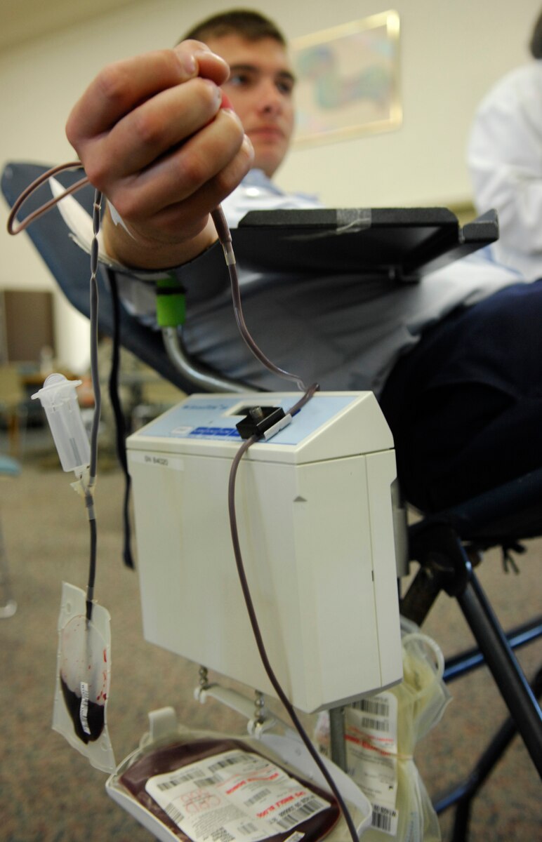 VANDENBERG AIR FORCE BASE, Calif. -- Waiting patiently, 2nd Lt. Christopher Walraven, a student at the 392nd Training Squadron, looks away as Deanna Soderholm, a registered nurse from the United Blood Services, removes the needle from his arm during a blood drive here Monday, Nov. 9, 2009. The blood drive was sponsored by the 576th Flight Test Squadron's Top 3. (U.S. Air Force photo/Airman 1st Class Heather R. Shaw)