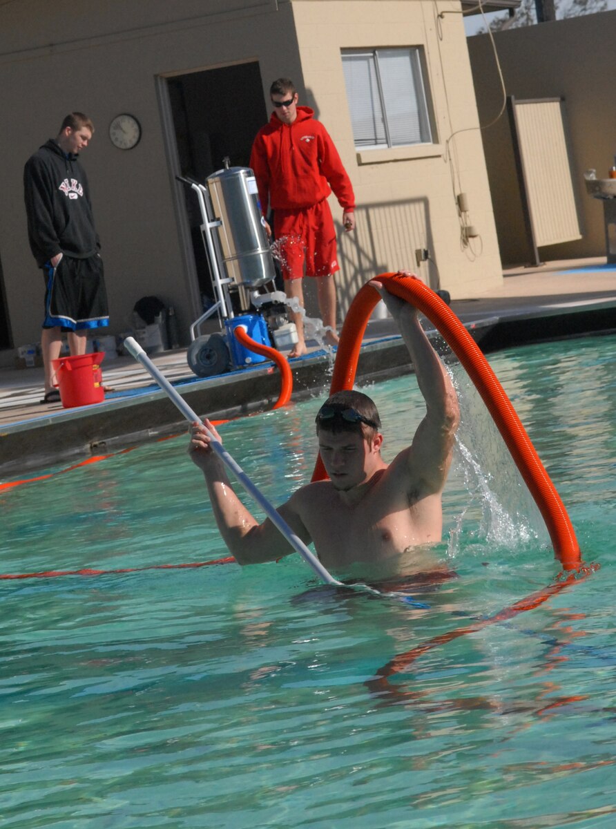 VANDENBERG AIR FORCE BASE, Calif. -- Artoro Castaneda, a construction worker with TRI County Construction, power drives in a screw to hold up the frame of a soffit for the new gym here Jan. 6. The new gym is projected to be finished in March. (U.S. Air Force photo/Airman 1st Class Christian Thomas)