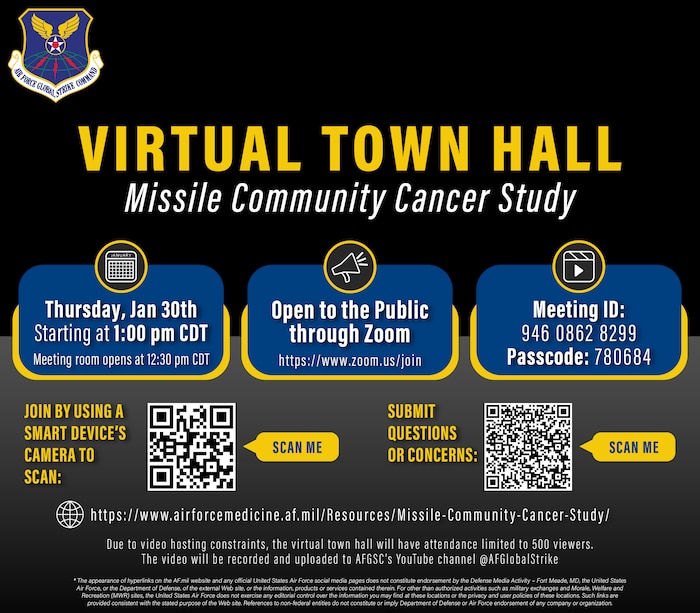 Information on how to attend the virtual Town Hall will be posted on the Missile Community Cancer Study website: https://www.airforcemedicine.af.mil/Resources/Missile-Community-Cancer-Study/