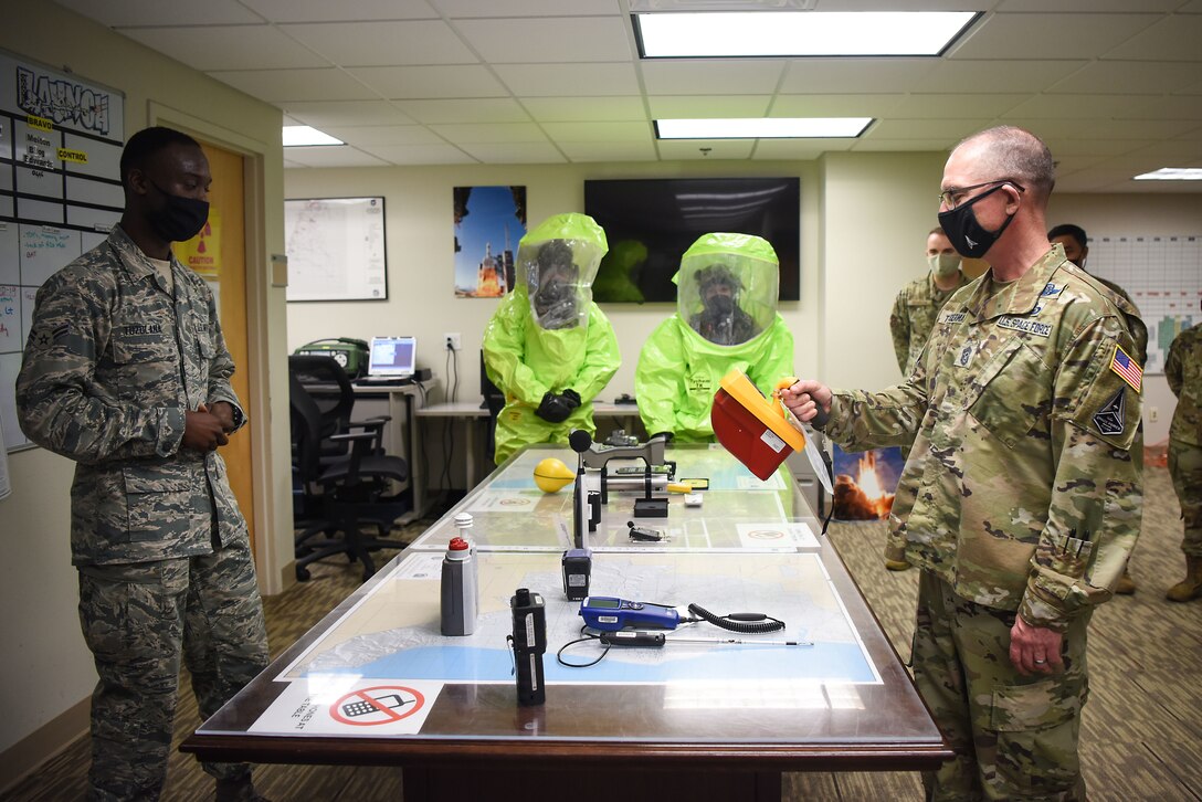 Chief Master Sgt. Roger A. Towberman, U.S. Space Force senior enlisted advisor, visits the 30th Medical Group Sept. 24, 2020, at Vandenberg Air Force Base, Calif. Airmen from across the 30th MDG briefed Towberman on the innovative medical capabilities the unit has used to support U.S. Air Force and U.S. Space Force professionals across the installation. The Airmen demonstrated their current COVID-19 testing capabilities, in addition to their air quality assessments, which are used as a precaution due to the California wildfires that have elevated the base’s Air Quality Index. (U.S. Space Force photo by Senior Airman Hanah Abercrombie)
