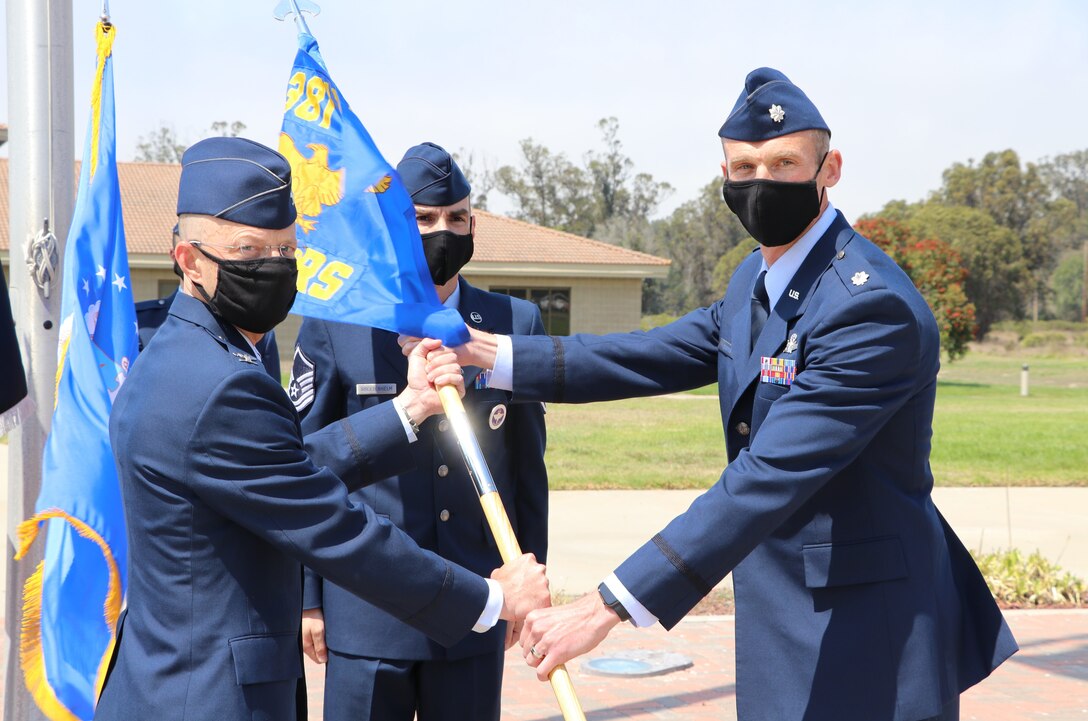 Col. Daniel Rickards, 381st Training Group commander, passes the 533rd Training Squadron guidon to Lt. Col. Charles Cooper, 533rd Training Squadron commander, during the 533rd TRS transfer to STAR Delta Provisional Sept. 3, 2020 at Vandenberg Air Force Base, Calif. The transfer ceremony brought 85 members into the newest U.S. military branch, the United States Space Force. This action symbolizes the change in service and leadership as part of the transfer under Space Training and Readiness Delta Provisional. (Courtesy Photo)