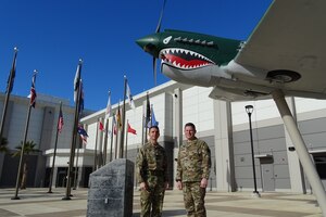 Students from the Air Warfare College (AWC) stand with U.S. Space Force Col. Shay Warakomski, Combined Force Space Component Command deputy commander, middle-right, during their visit to Vandenberg Space Force Base, Calif,March 13, 2023. Warakomski led a discussion focused on delivering space