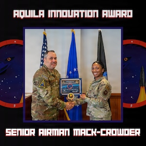 U.S. Air Force Col. Lawrence Smith, left, Space Launch Delta 30 deputy commander, presents Vandenberg’s Hawk of the Week Award to Staff Sgt. Aramis Quinones-Tirado, right, 2nd Space Launch Squadron mission assurance technician, during a weekly installation leadership meeting at Vandenberg Space